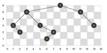 라이언의 규칙에 맞게 이진트리의 노드만 좌표 평면에 그리면 다음과 같다. (이진트리의 각 노드에는 1부터 N까지 순서대로 번호가 붙어있다.)