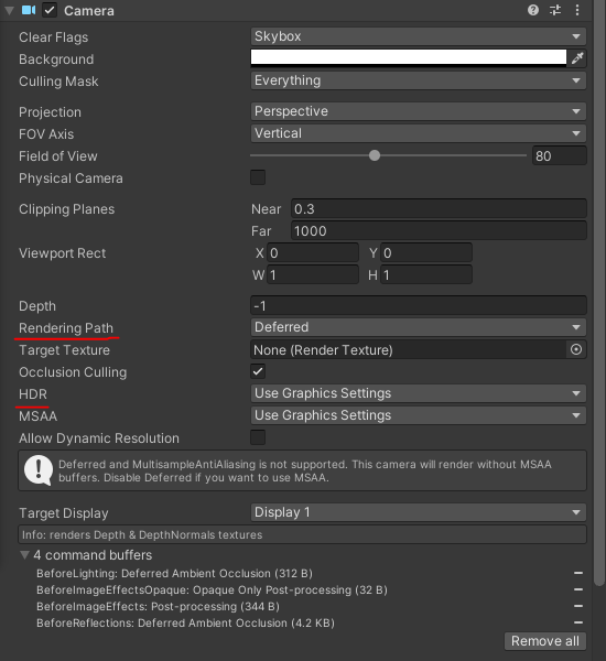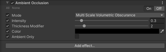 | Mode | Multi Scale Volumetric Obscurance (MSVO) : 이 모드는 콘솔 및 데스크탑 플랫폼에 최적화되어 있습니다. Scalabel Ambient Obscurance 보다 더 나은 그래픽과 더 빠르게 실행 되지만 컴퓨터 셰이더 지원이 필요합니다. |