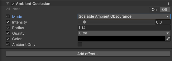 참고 : https://learn.unity.com/tutorial/post-processing-effects-ambient-occlusion-2019-3#5e31aa5fedbc2a21ae27e91e