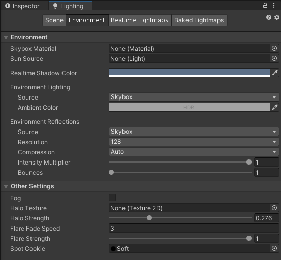 1. 기본 세팅 : Ambient Occlusion을 쉽게 확인하기 위해 상단 바 Window -> Rendering -> Lighting에서 Skybox Material을 제거했습니다.