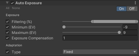 Progressive (점진적 모드) 는 지정된 비율로 노출을 조정합니다. Progressive 모드는 플레이 모드 및 빌드에서만 작동합니다. 편집 모드에서는 이 설정과 상관없이 Fixed (고정 모드) 가 적용됩니다. |