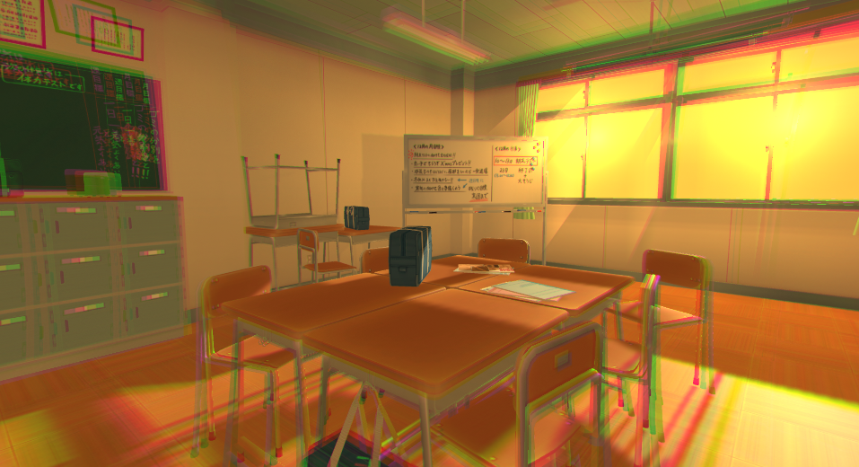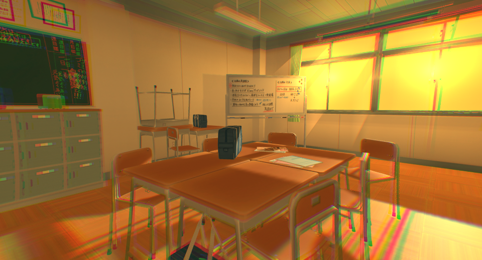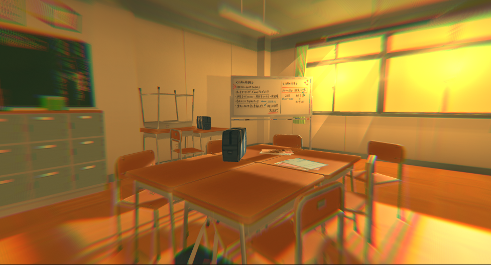Chromatic Aberration makes your scene appear as though it were recorded through a lens that is unable to converge light at the edges. This is common in low-end lenses, and is a quick and easy effective way to give your scene that “shot on glass” look.