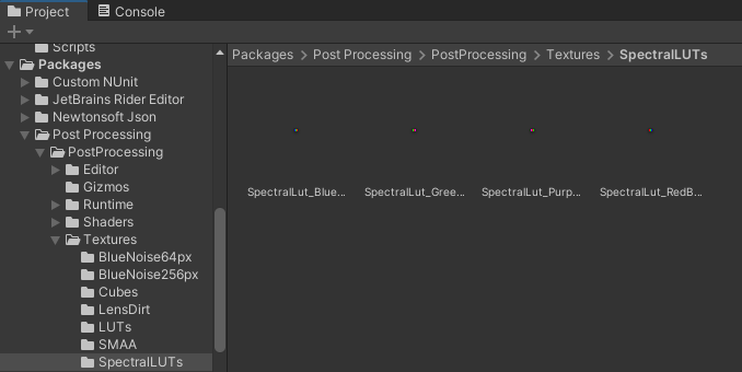 | Spectral Lut | 스펙트럼 조회 테이블(LUT)은 장면의 나머지 부분에 영향을 주지 않고 효과의 색조를 이동하는 데 사용되는 선택적 텍스처입니다. Post Processing 패키지에는 4개의 3X1 텍스처 세트가 포함되어 있습니다. 1. 빨간색 / 파란색 (기본값) 2. 파란색 / 빨간색 3. 초록색 / 자주색 4. 자주색 / 초록색 ![]() |