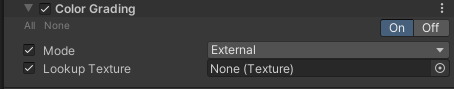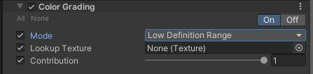 Color Grading 연산보다 먼저 적용할 Lookup Texture 선택합니다. strip format 형식에 (256x16 , 1024x32) 사이즈를 선택 해야 합니다. 아무 것도 선택 안할 시 내부적으로 중립적인 것이 생성이 됩니다. |