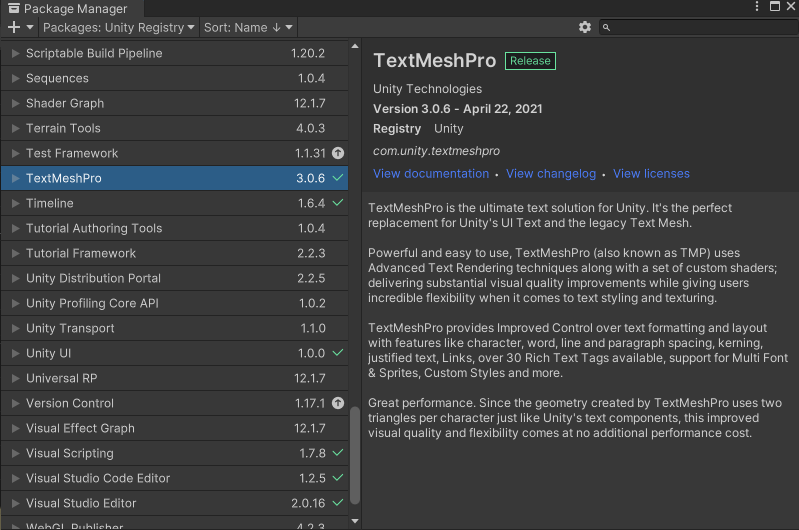 그다음 TextMeshPro를 사용하기 위해 패키지를 다운로드하여 줍니다.
