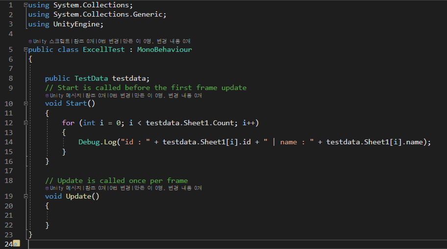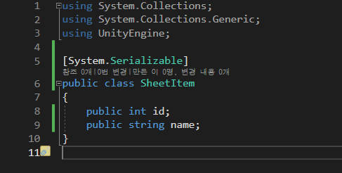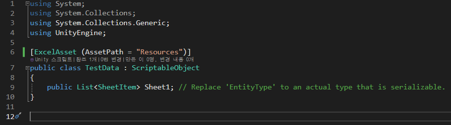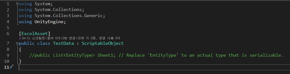 실행하면 이렇게 ScriptableObject 스크립트가 만들어지고 엑셀에 시트 이름과 동일한 변수가 추가가 됩니다.