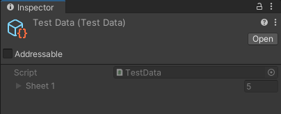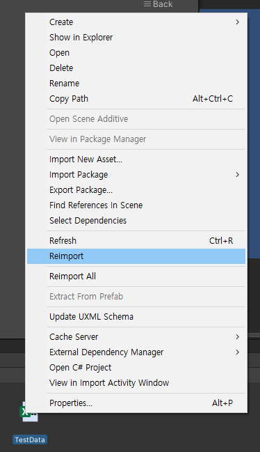 그러고 나서 에디터로 돌아와 엑셀 파일을 Reimport 해 주면 스크립트 이름과 동일한 Scriptable object 가 생기게 됩니다.